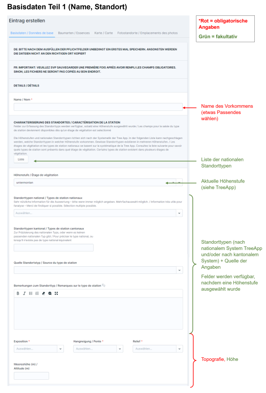 Ein Vorkommen kann mehrere Baumarten umfassen. Die Angaben und Beobachtungen werden für jede Baumart separat erfasst.