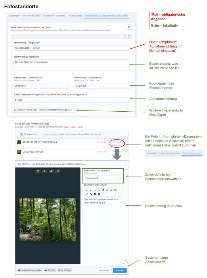 Nachdem ein Fotostandort definiert worden ist, können ihm in der Chronologie im Formularteil "Baumarten" Fotos zugeordnet werden (siehe Bild rechts, unterer Teil).