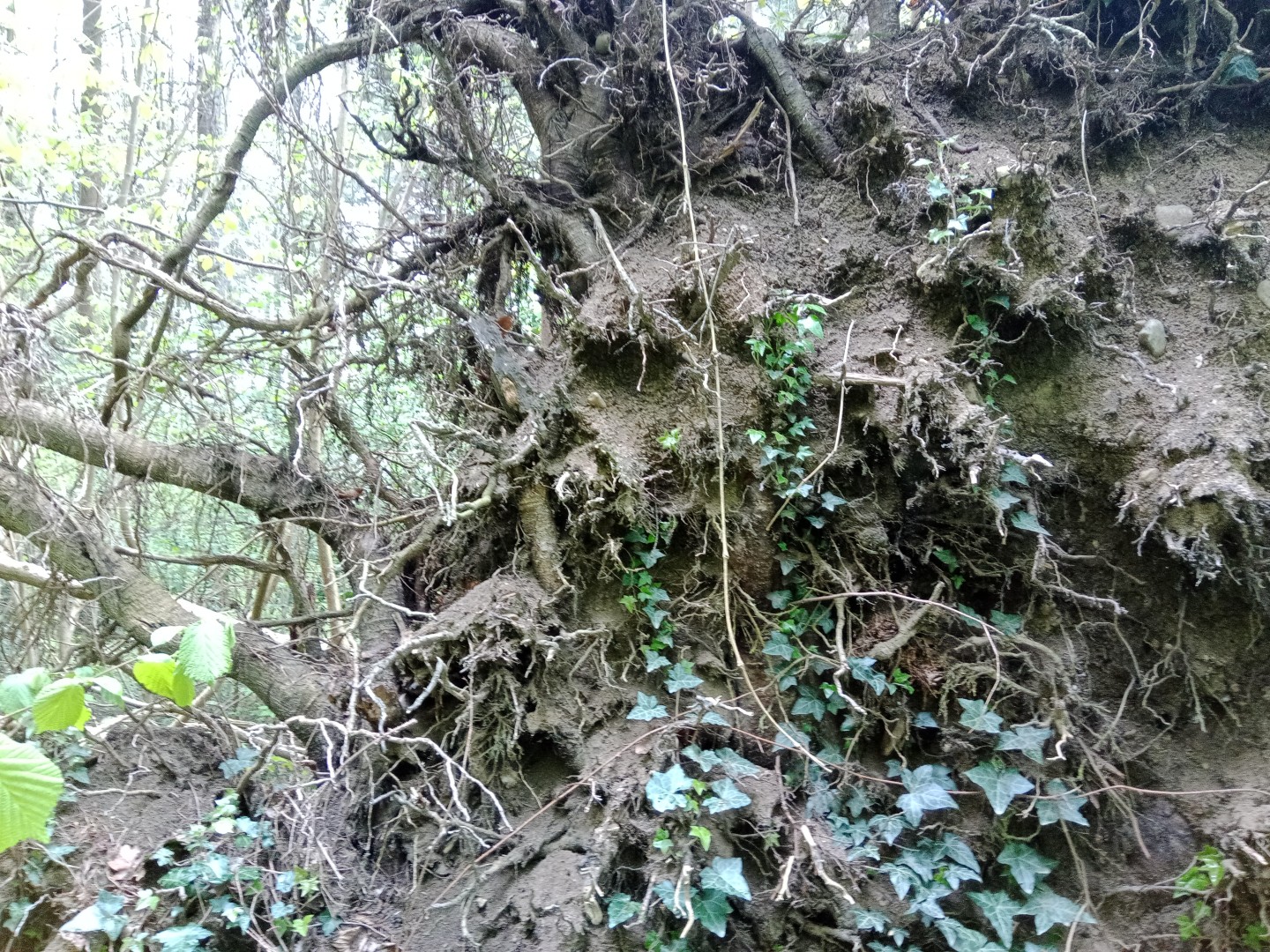 La plupart des douglas sont vitaux malgré parfois un manque d'éclaircie (couronne <1\3 de la hauteur de l'arbre). Descente de cime et brunissement/rougissement de certaines couronnes remarqué sur orthophoto 2023. Cause probable évoquée : "coup de froid tardif" après hiver doux en 2023. La station n'est non plus pas optimale (hêtraie â Gouët). Sur l'arbre renversé, les racines sont traçantes et manque de racine pivot; sol caillouteux (moraine), basique (ail des ours présent en plus grande quantité sur la partie est où de plus gros dégâts sont visible sur l'orthophoto 2023); la plupart des douglas ont aussi bien récupéré du froid et ont des couronnes verte en 2025